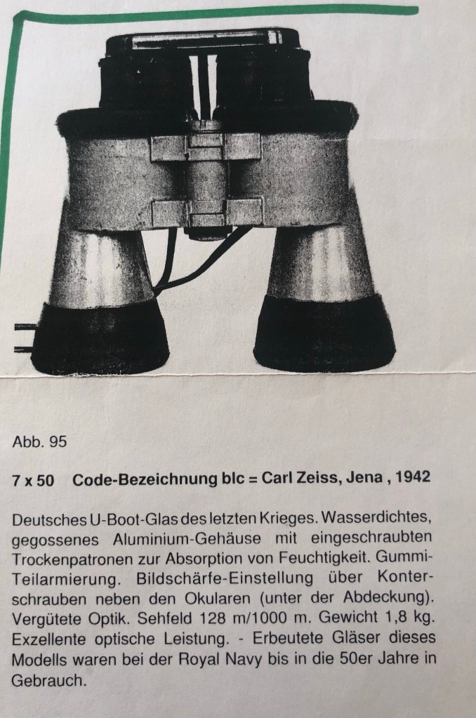 I own this pair of Zeiss U-Boat binoculars made in Jena in 1942. They are fixed focus 7X50. I had them serviced in England a few years ago. They are now bright and razor sharp. People looking through them the first time just say “Wow!”