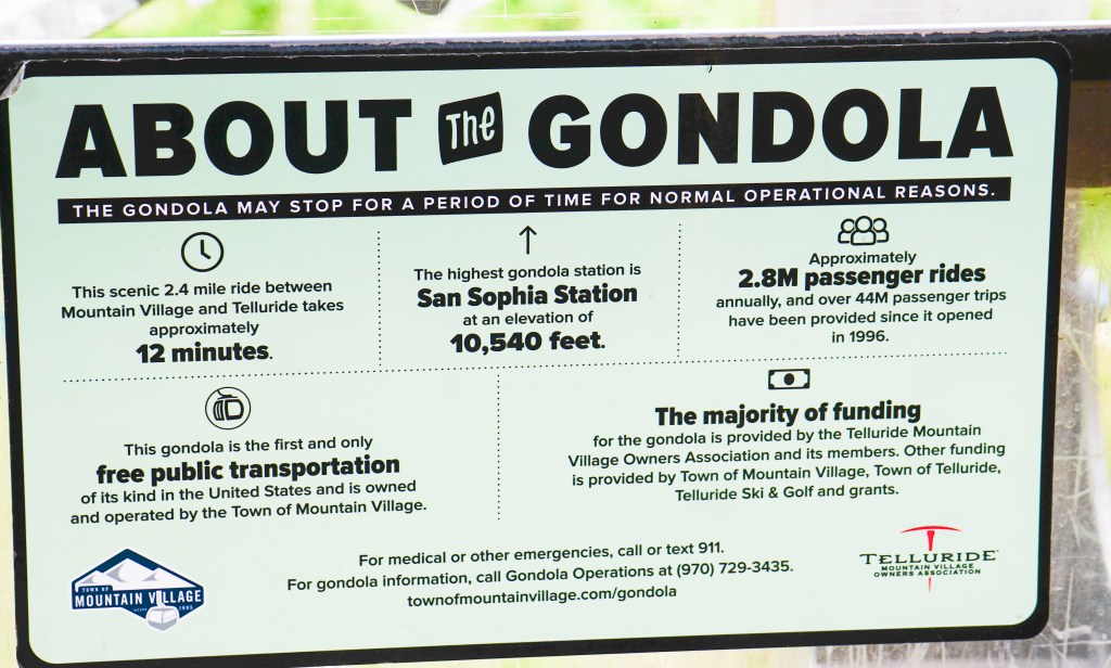 The scenic ride between Telluride and Mountain Village is 2.4 miles long and takes about 12 minutes. Millions have enjoyed the wonderful views. The highest point is 10,540 feet! The ride is free.