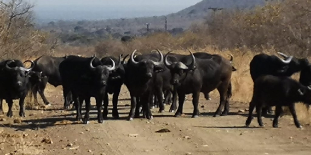 Note the warthog kill to the right of some of the pictures of the lions. Notice the buffalo herd guarding the young buffalo (young buffalo with gold/brown coat and short horns). And what about the young elephant reaching for the water. Then, shiver when you look at the buffalo bull? Scary close.