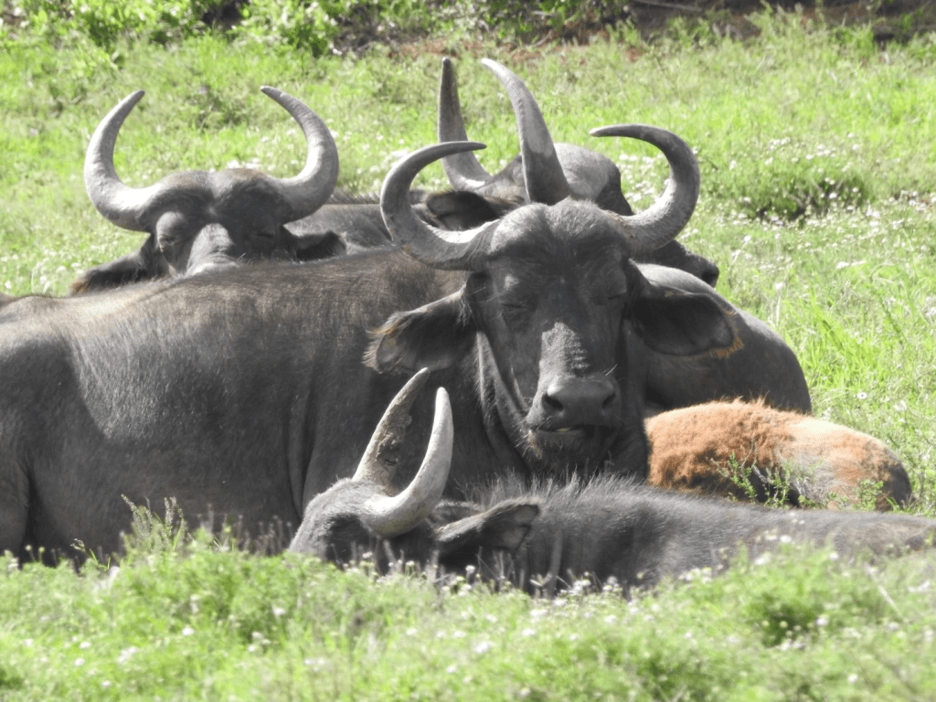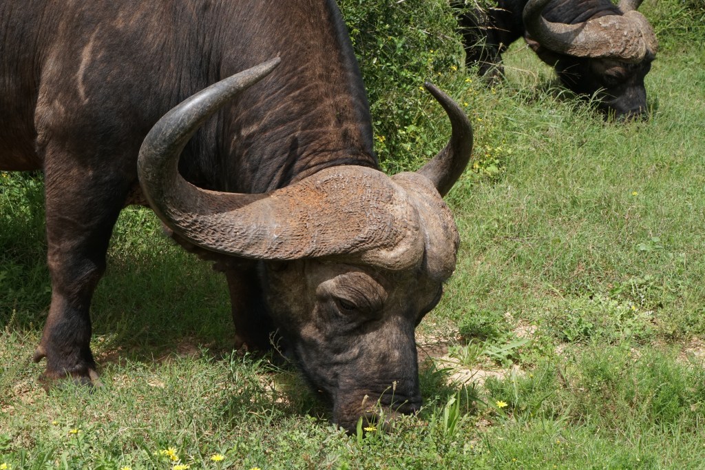 Note the warthog kill to the right of some of the pictures of the lions. Notice the buffalo herd guarding the young buffalo (young buffalo with gold/brown coat and short horns). And what about the young elephant reaching for the water. Then, shiver when you look at the buffalo bull? Scary close.
