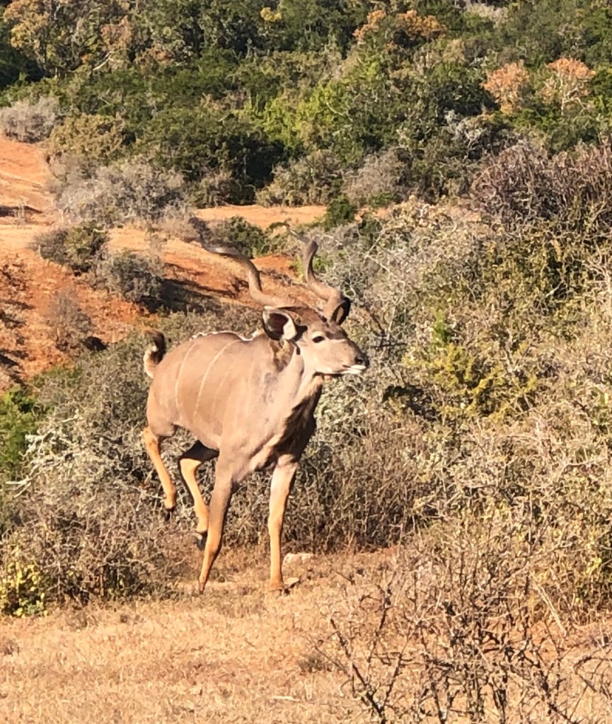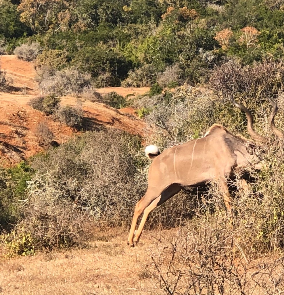 The Kudu prepares to jump and then jumps. See the two pictures below. Taken in the Addo Elephant Park. South Africa. Such power and grace.