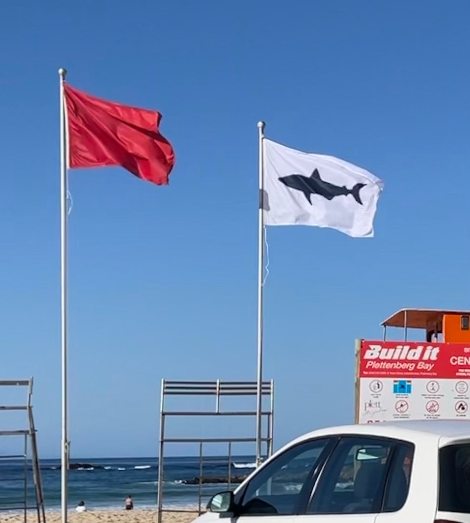 Two warning lags flying in Plettenberg Bay, South Africa following the tragic shark attack there on 28 June 2022. The two flags prohibit bathing and are a shark warning. A very sad time.